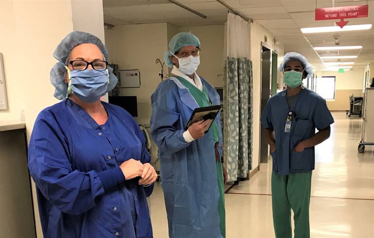 Courtesy of HILO MEDICAL CENTER Director of Surgical Services Jeanean Dillard, anesthesiologist Dr. Randy Gerber and operating room technician Brendan Wong.