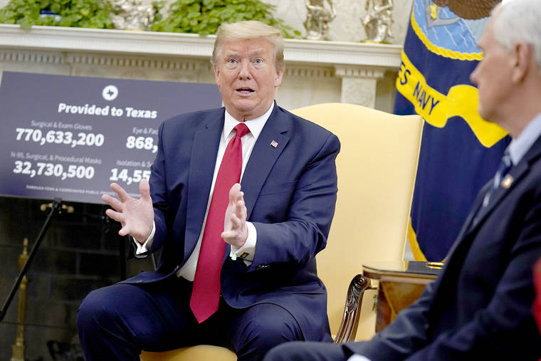President Donald Trump speaks during a meeting about the coronavirus response with Gov. Greg Abbott, R-Texas, in the Oval Office of the White House, Thursday, May 7, 2020, in Washington. Vice President Mike Pence listens at right. (AP Photo/Evan Vucci)