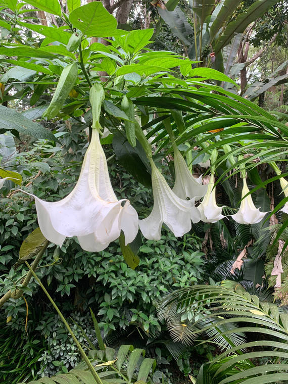The scent of orange blossoms and, of course, grapefruit, lime, lemon and tangerine blossoms all have delicious fragrance. During the longer days of summer, many species of ginger are in full bloom, and in the evening white, yellow and rose flowered angel trumpets make for perfect garden romance.