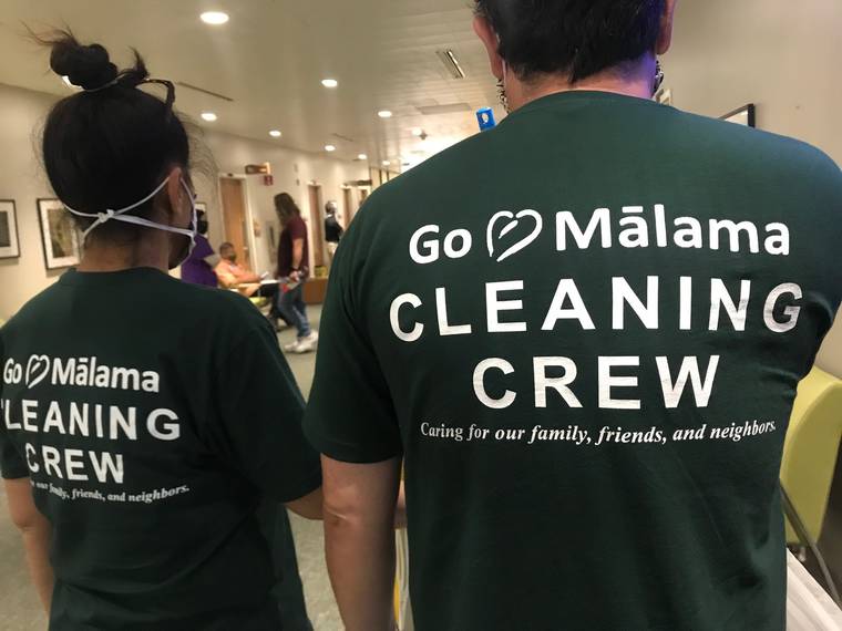 HILO MEDICAL CENTER Shirts worn by Hilo Medical Center’s COVID-19 cleaning crew, hired to clean high-use and high-touch areas and surfaces, makes them easy to spot in the hospital.