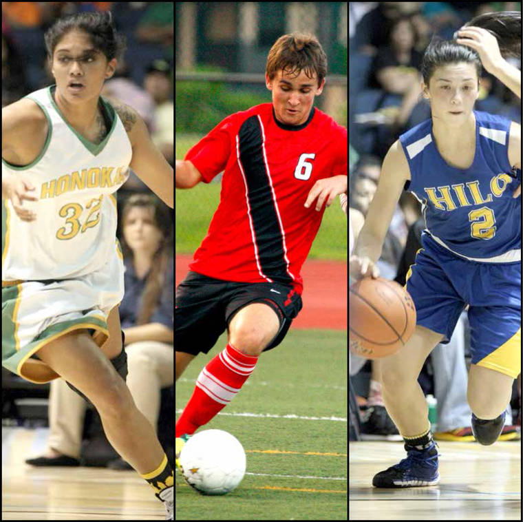 Tribune-Herald file photos From left, Honokaa’s Chancis Fernandez, Hawaii Prep’s Justin Perry and Hilo High’s Chailey Cabalis all helped their teams to big victories on a memorable night of high school sports on Saturday, Feb. 8, 2014.