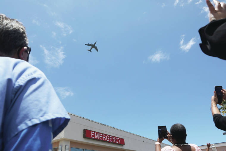 A KC-135 aircraft from Joint Base Pearl Harbor-Hickam flew over Hilo Medical Center at 12:31 p.m. Thursday to salute all front-line workers battling COVID-19.