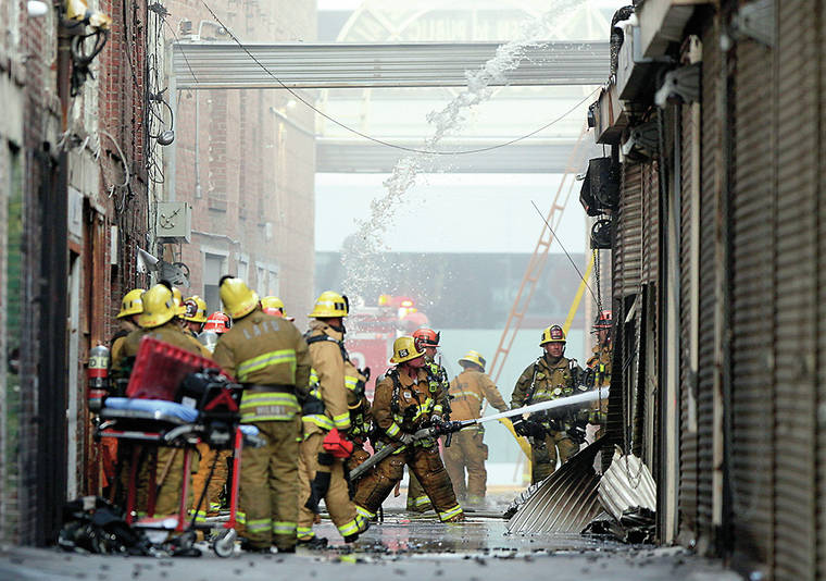 Los Angeles Fire Department firefighters work the scene of a structure fire Saturday that injured multiple firefighters in Los Angeles. (AP Photo/Damian Dovarganes)