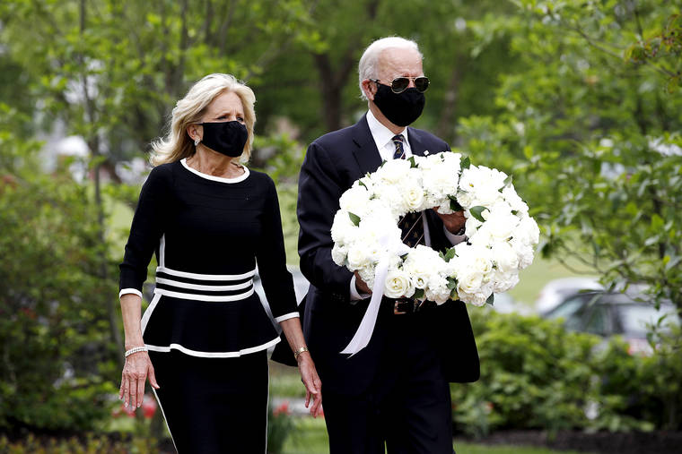 Biden and his wife, Jill, laid a wreath of white flowers tied with a white bow, and bowed their heads in silence at the park. He saluted. “Never forget the sacrifices that these men and women made,” he said after. “Never, ever, forget.”