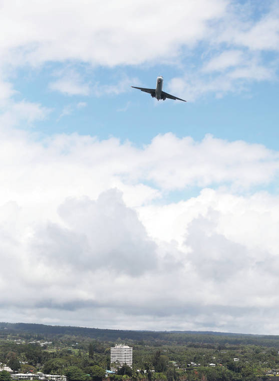 Photo by Kelsey Walling/Tribune-Herald A Hawaiian Airlines plane flies over Hilo Bay to land at the Hilo International Airport.