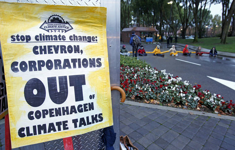 FILE - In this Dec. 7, 2009, file photo, demonstrators block the main entrance of Chevron Corp. in San Ramon, Calif. A federal appeals court ruled Tuesday, May 26, 2020 against major oil companies in lawsuits brought by California cities and counties seeking damages for the impact of climate change. A panel of the 9th U.S. Circuit Court of Appeals said state courts are the proper forum for the lawsuits alleging that Big Oil promoted petroleum as environmentally responsible when producers knew it was causing damage. (AP Photo/Paul Sakuma, File)