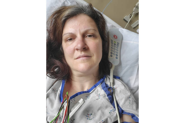 This May 6, 2020 photo provided by Darlene Gildersleeve, 43, of Hopkinton, N.H. shows her at a Manchester, N.H. hospital. Gildersleeve thought she had recovered from COVID-19. Doctors said she just needed rest. And for several days, no one suspected her worsening symptoms were related — until a May 4 video call, when her physician heard her slurred speech and consulted a specialist. “You’ve had two strokes,’’ a neurologist told her at the hospital. (Darlene Gildersleeve via AP)
