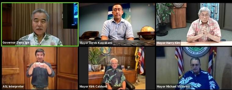Gov. David Ige holds a Zoom session with county mayors Thursday. (Screen capture/Courtesy)