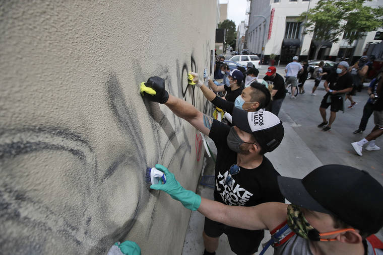 Volunteers clean graffiti from a store wall Monday, June 1, 2020, in Santa Monica, Calif., a day after unrest and protests over the death of George Floyd, a black man who died in police custody in Minneapolis. Floyd died after being restrained by Minneapolis police officers on May 25. (AP Photo/Marcio Jose Sanchez)