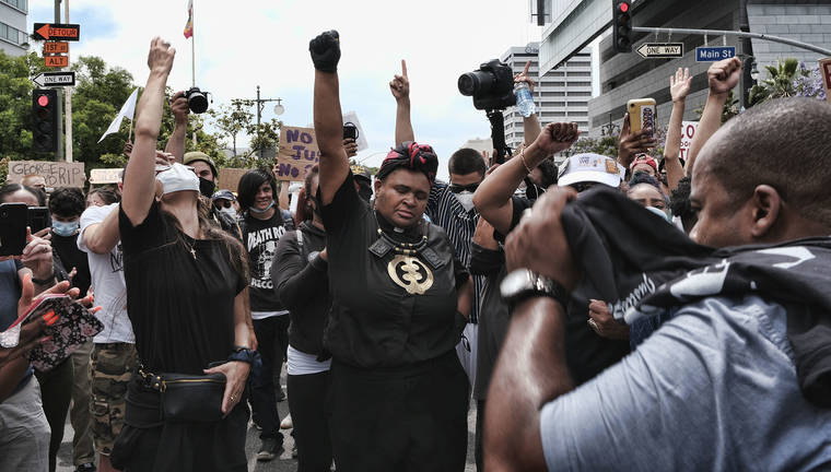 Protesters raise their fists while taking part in a Black Lives Matter protest outside the police headquarters in downtown Los Angeles on Tuesday, June 2, 2020, over the death of George Floyd, a black man who was in police custody in Minneapolis. Floyd died after being restrained by Minneapolis police officers on Memorial Day. (AP Photo/Richard Vogel)
