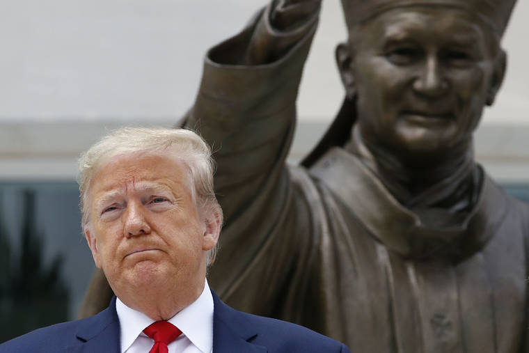 President Donald Trump visits Saint John Paul II National Shrine on Tuesday, June 2, 2020, in Washington. First lady Melania Trump accompanied him on the visit. (AP Photo/Patrick Semansky)