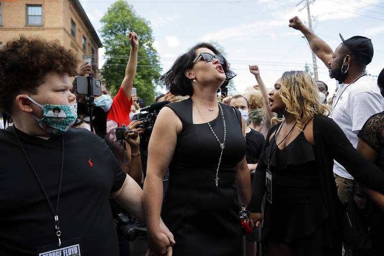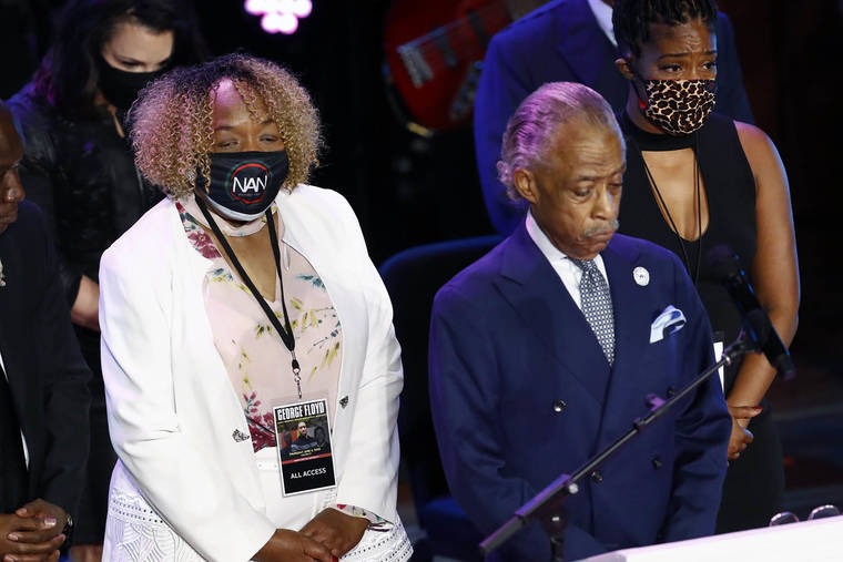 MINNEAPOLIS — Hollywood celebrities, musicians and political leaders gathered in front of the golden casket of George Floyd during a fiery memorial Thursday for the man whose death at the hands of police sparked global protests, with a civil rights leader declaring it is time for black people to demand, “Get your knee off our necks!”