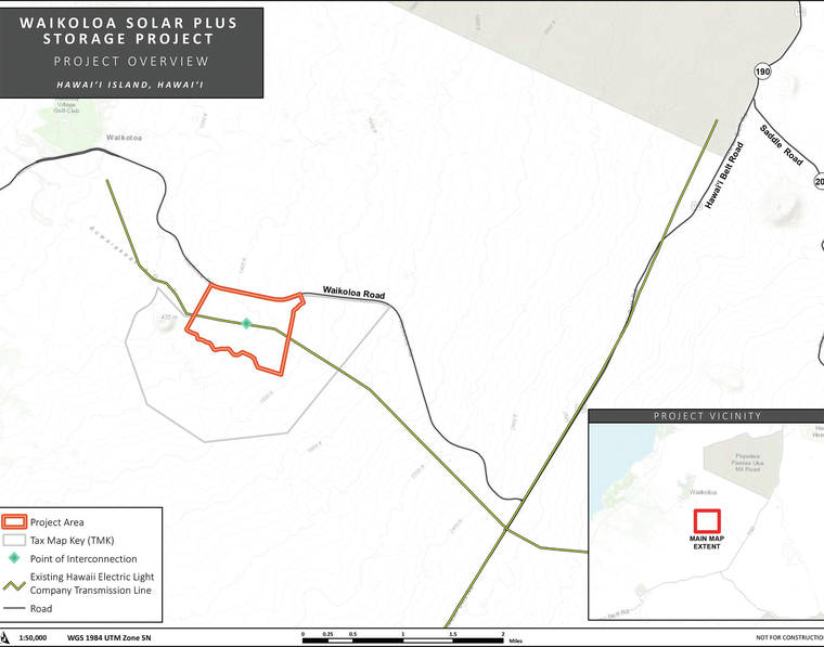 AES said the project, located on the northeast side of Waikoloa Road, near the intersection of Highway 190, is expected to contribute approximately 7.1% of Hawaii Island’s energy needs, result in total avoided fuel consumption of 511,086 barrels of oil over its 25-year lifespan