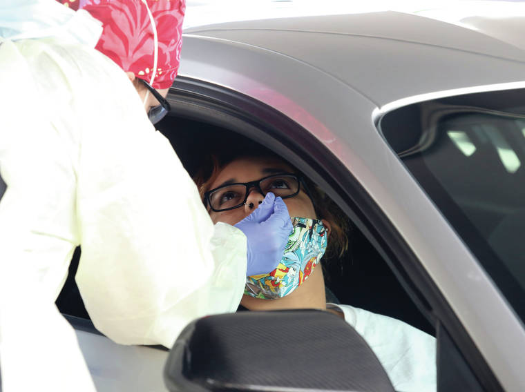 KELSEY WALLING/Tribune-Herald Carrie Sandlin tests a patient for COVID-19 on May 29 at the drive-through testing site across from Hilo Medical Center.