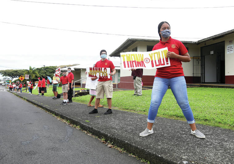 Principal Michael Pa‘ekukui watched as the students and faculty thanked the community with signs, shakas and waves.