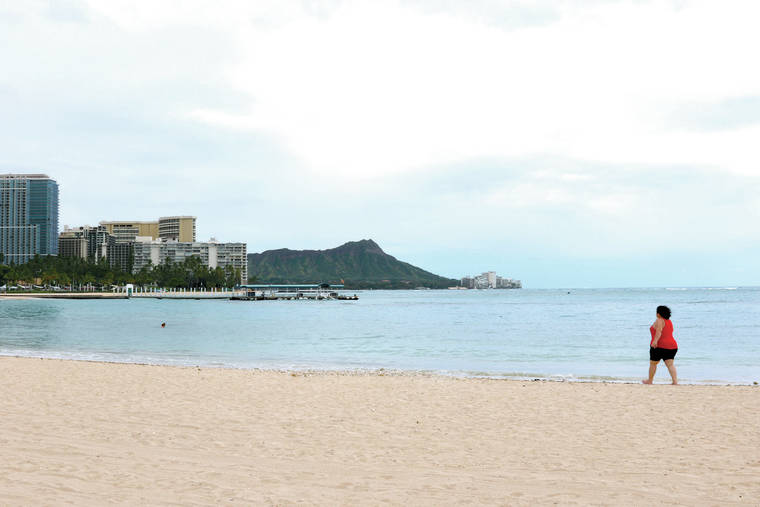 In this Associated Press file photo from April, a woman walks on Waikiki Beach in Honolulu. A proposal by University of Hawaii researchers recommends using point-of-departure COVID-19 testing as a way to revive the tourism industry.