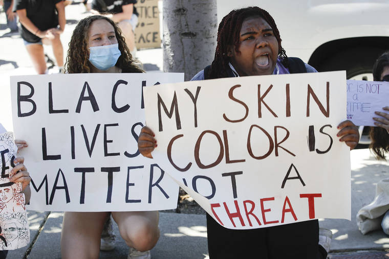 Demonstrators shout slogans Tuesday, June 9, 2020, in Culver City, Calif., during a student-led protest over the death of George Floyd who died May 25 after he was restrained by Minneapolis police. (AP Photo/Marcio Jose Sanchez)