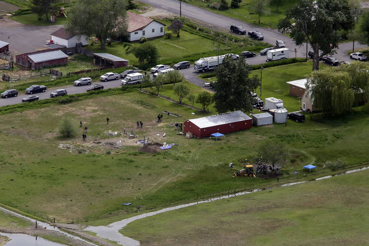 In this aerial photo, investigators search for human remains at Chad Daybell’s residence in the 200 block of 1900 East, Tuesday, June 9, 2020, in Salem, Idaho. Authorities say they uncovered human remains at Daybell’s home as they investigated the disappearance of his new wife’s two children. Police in the small town of Rexburg say Daybell was taken into custody Tuesday. He had recently married the children’s mother, Lori Vallow Daybell, who has been charged with child abandonment. (John Roark/The Idaho Post-Register via AP)