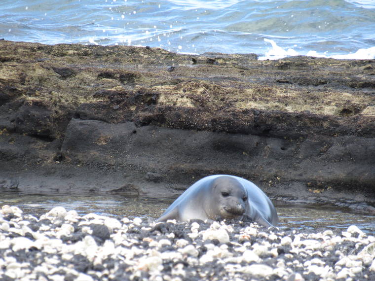 Staff from The Marine Mammal Center’s Ke Kai Ola Hawaiian Monk Seal Hospital, who have been monitoring and protecting the seals, photographed tire tracks on the beach and they worry “the very active” pup could be injured or killed while roaming around the area. West Hawaii Today is not identifying the specific beach to protect the critically endangered mammal.