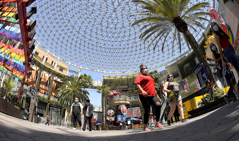 People walk through Universal CityWalk Thursday near Universal City, Calif. (AP Photo/Mark J. Terrill)