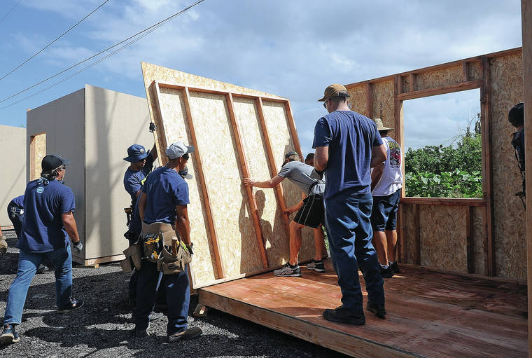 More than 50 volunteers, including members of the County Fire Department and Recruit Class, erected walls and roofs, installed windows and doors along the roadway that passes mauka of Makaeo Pavilion. Tinguely Development had been on site all week, working in partnership with the County in prepare the site for vertical construction.