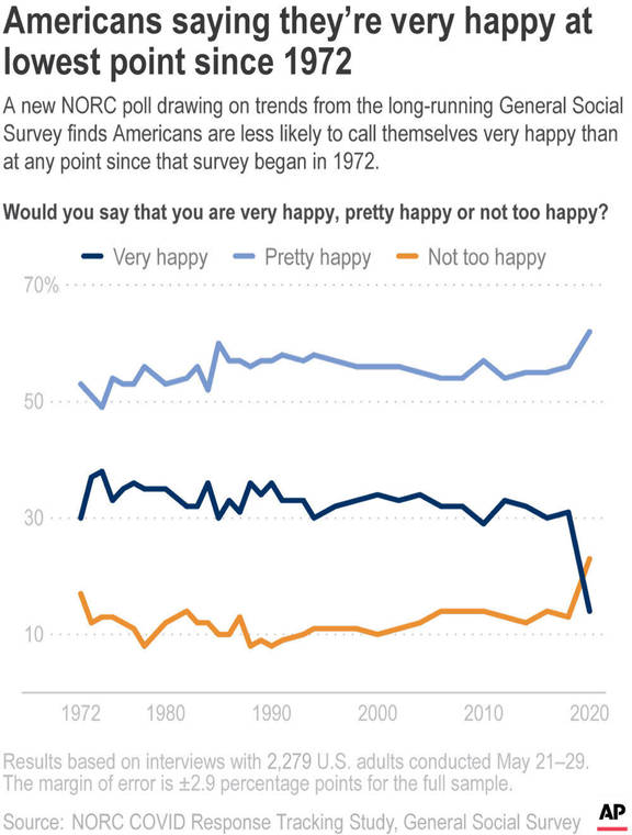 The survey, conducted in late May, draws on nearly a half-century of research from the General Social Survey, which has collected data on American attitudes and behaviors at least every other year since 1972. No less than 29% of Americans have ever called themselves very happy in that survey.