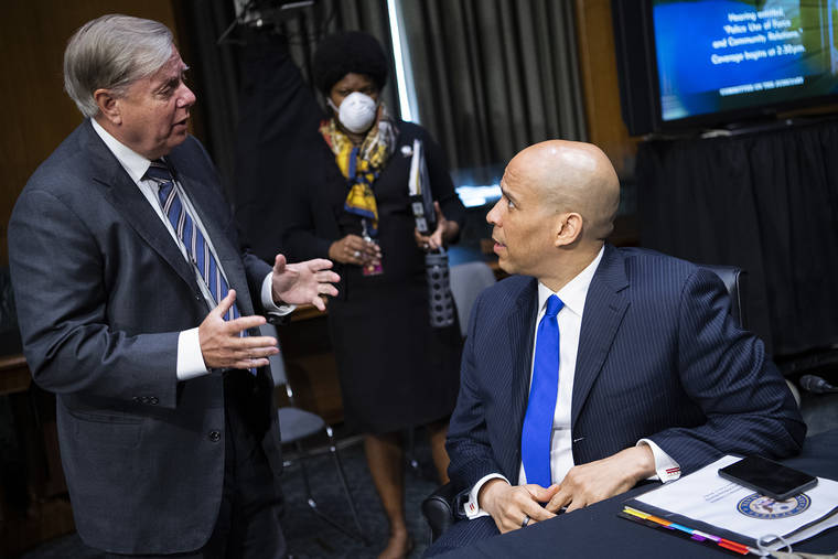 Chairman Lindsey Graham, R-S.C., left, talks with Sen. Cory Booker, D- N.J., prior to a Senate Judiciary Committee hearing on police use of force and community relations on on Capitol Hill, Tuesday, June 16, 2020 in Washington. (Tom Williams/CQ Roll Call/Pool via AP)