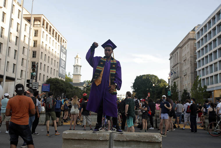 Protesters gather near the White House on Tuesday in Washington amid continuing anti-racism demonstrations following the death of George Floyd, a Black man who was restrained by police in Minneapolis. (AP Photo/Maya Alleruzzo)