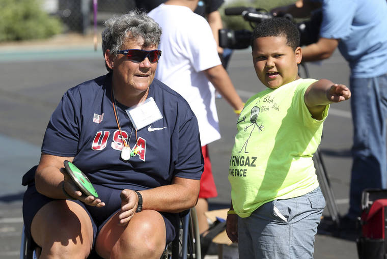 FILE - In this May 2, 2015, file photo, Paralympian Angela Madsen, left, works with Los Angeles Unified School District students during Ready, Set, Gold! Day at Trinity Street Elementary in Los Angeles. The U.S. Coast Guard says the body Madsen, who was rowing from California to Hawaii, is headed to Tahiti. A friend of Madsen, 60, a paraplegic Marine Corps veteran, contacted the Coast Guard on Sunday, June 21, 2020, after not hearing from her for more than 24 hours. The next day, a National Guard air crew flew over her last known location more than 1,000 miles off Hawaii and spotted her lifeless body in the water, tethered to her boat. A boat en route to Tahiti retrieved her body. (Photo by Matt Sayles/Invision for Samsung/AP Images, File)
