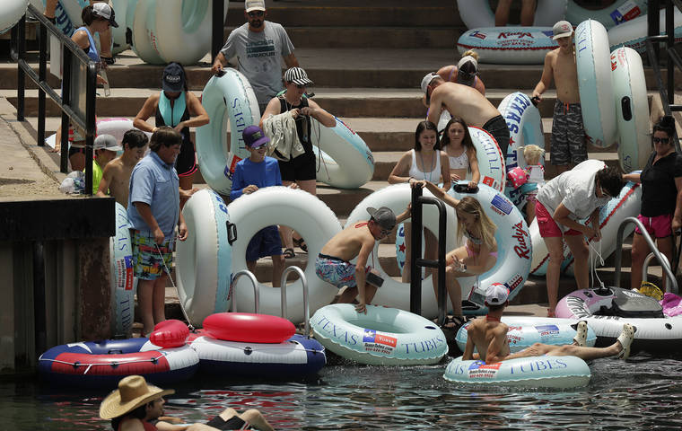 Tubers prepare to float the Comal River despite the recent spike in COVID-19 cases, Thursday, June 25, 2020, in New Braunfels, Texas. Texas Gov. Greg Abbott said Wednesday that the state is facing a “massive outbreak” in the coronavirus pandemic and that some new local restrictions may be needed to protect hospital space for new patients. (AP Photo/Eric Gay)
