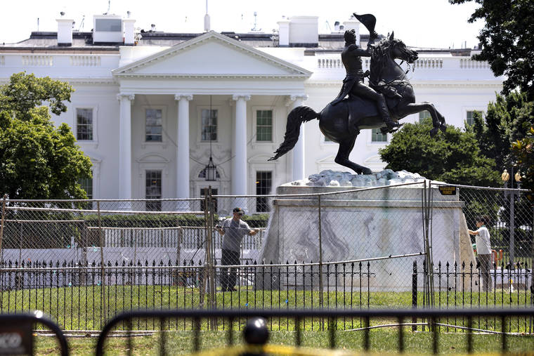 The base of the statue of former president Andrew Jackson is power washed inside a newly closed Lafayette Park on Wednesday in Washington. (AP Photo/Jacquelyn Martin)