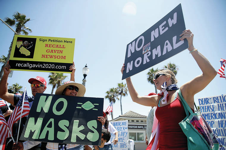 Demonstrators hold signs as they protest the lockdown and wearing masks Saturday in Huntington Beach, Calif. (AP Photo/Marcio Jose Sanchez)