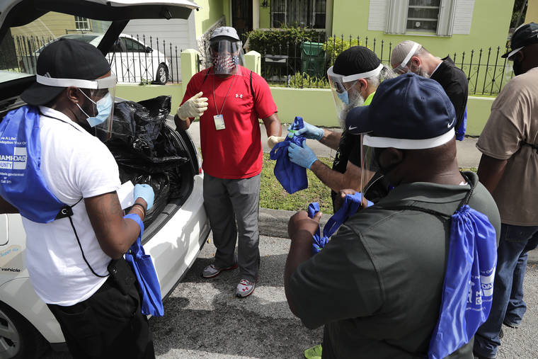 Morris Copeland, of the Strategic Urban Response to Guideline Education (SURGE) group, center, passes out kits to team members which they will distribute to residents living in COVID-19 hotspots, during the new coronavirus pandemic, Wednesday, July 1, 2020, in the Liberty City neighborhood of Miami. The teams were formed by Miami-Dade County to help flatten the curve of the coronavirus. The kits contain masks, hand sanitizer, and information about testing locations. (AP Photo/Lynne Sladky)