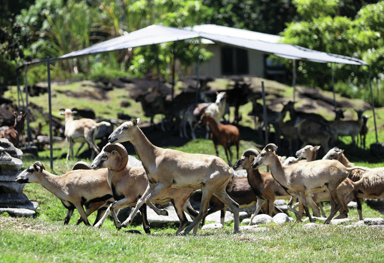 KELSEY WALLING/Tribune-Herald Goats and sheep trot together on a farm Wednesday in Hawaiian Paradise Park. Many goats and sheep at the farm have broken bones while running back and forth in the dark during fireworks displays at neighboring residences for the July 4 holiday.