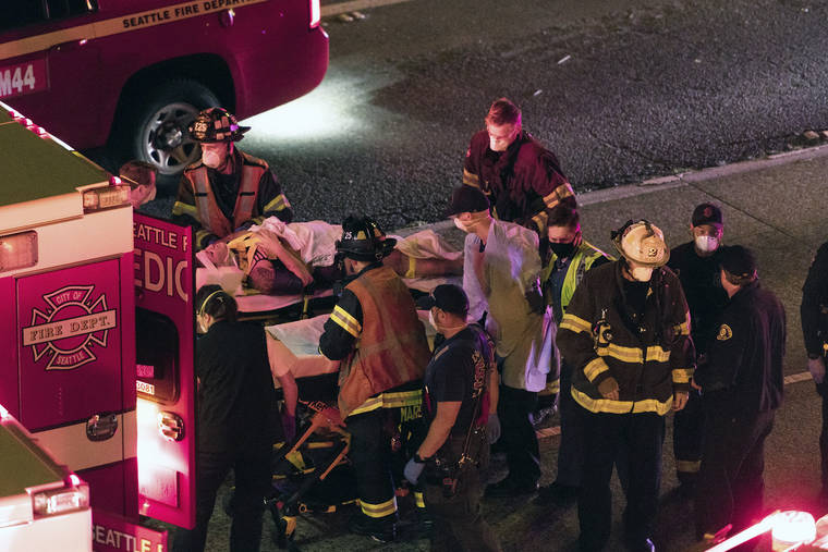 Emergency workers bring an injured person to an ambulance after a driver sped through a protest-related closure on the Interstate 5 freeway in Seattle, authorities said early Saturday, July 4, 2020. Dawit Kelete, 27, has been arrested and booked on two counts of vehicular assault. (James Anderson via AP)