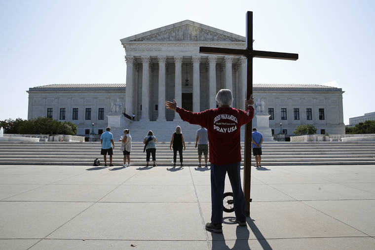Tom Alexander holds a cross as he prays prior to rulings outside the Supreme Court on Capitol Hill in Washington, Wednesday, July 8, 2020. The Supreme Court is siding with two Catholic schools in a ruling that underscores that certain employees of religious schools, hospitals and social service centers can’t sue for employment discrimination.(AP Photo/Patrick Semansky)