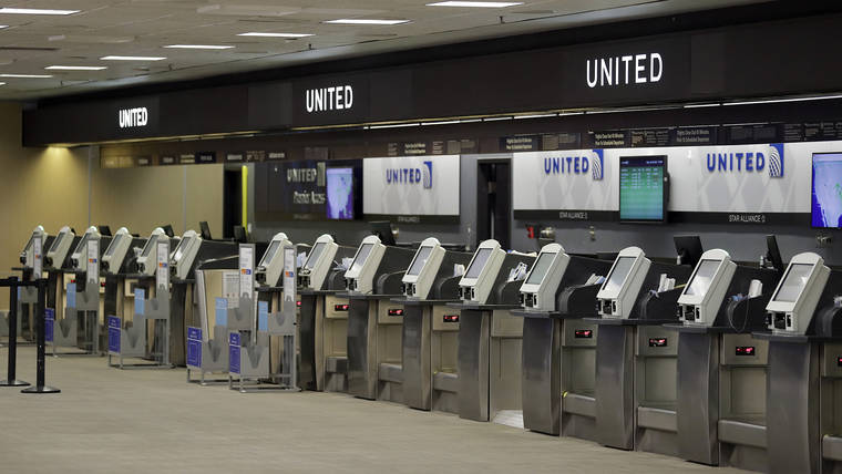 FILE - In this April 24, 2020 file photo, empty United Airlines ticket machines are shown at the Tampa International Airport in Tampa, Fla. United United Airlines will send layoff warnings to 36,000 employees - nearly half its U.S. staff - in the clearest signal yet of how deeply the virus outbreak is hurting the airline industry. United officials said Wednesday, July 8 that they still hope to limit the number of layoffs by offering early retirement, but they have to send notices this month to comply with a law requiring that workers get 60 days’ notice ahead of mass job cuts. (AP Photo/Chris O’Meara, File)