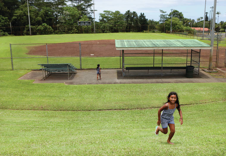 Kelsey Walling/Tribune-Herald Kawailani Kaleohano runs up a hill from the baseball field at Shipman Park in Keaau on Friday. The land behind the baseball field would be used for a commercial center, according to a project being developed by W.H. Shipman.