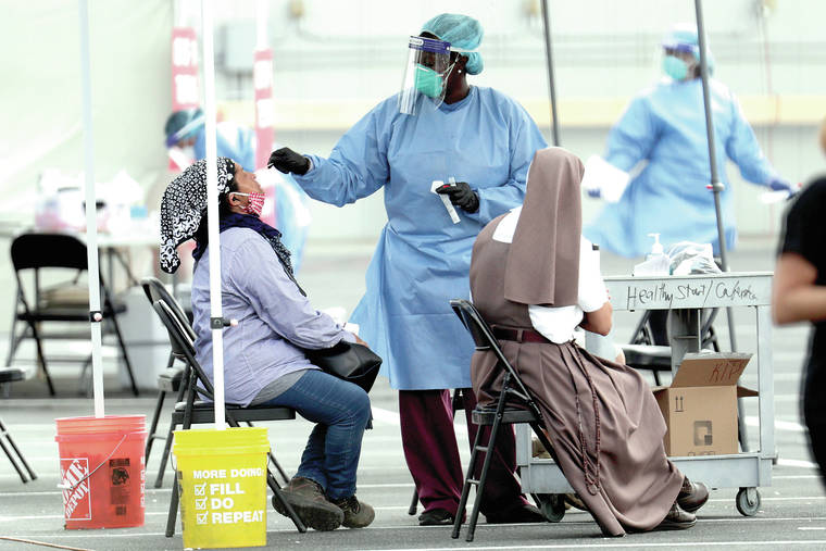 A health care worker administers a COVID-19 test on July 6 at the Martin Luther King Jr. Clinica Campesina Health Center in Homestead, Fla. (AP Photo/Lynne Sladky)
