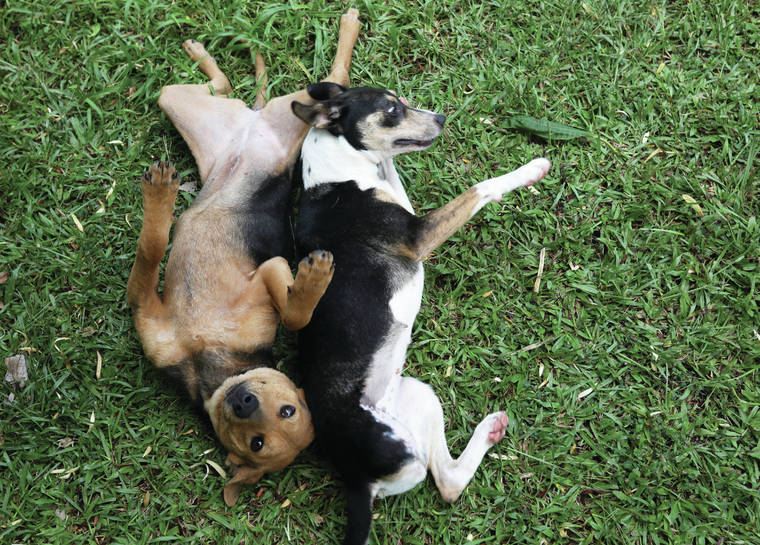 Gemma and Jen are two young, adult dogs that are ready to be adopted or fostered. Last Tuesday, they played together in a yard at the Keaau shelter to get some exercise.