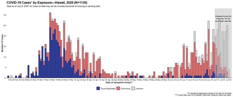 Hawaii’s virus cases by types of exposure, through July 9.