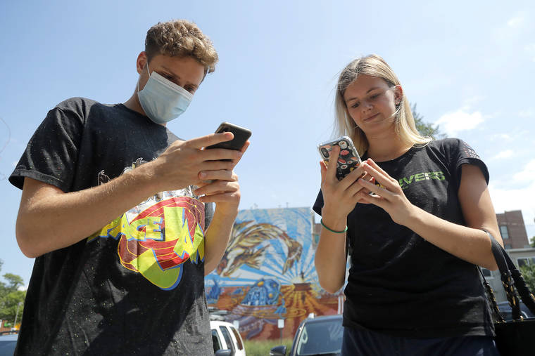 Maxwell Strome, left, and his friend Erica Dawson order food on their phones outside the R. House food hall, Wednesday, July 15, 2020, in Baltimore. The hall, which houses a variety of restaurants, has modified its seating areas as well as implementing an order and pay by phone system to ensure contactless transactions between restaurant operators and customers. (AP Photo/Julio Cortez)