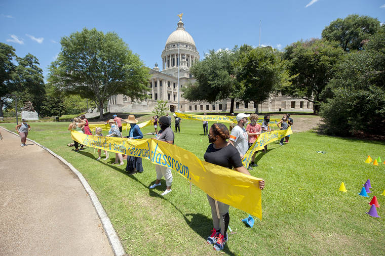 Teachers illustrate the average size of a Mississippi classroom and how only 11 socially distanced students would be able to fit in it during a rally Friday at the state Capitol in Jackson, Miss. (Barbara Gauntt/The Clarion-Ledger via AP)