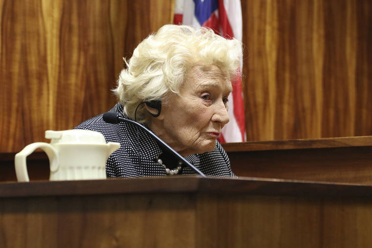 FILE - In this March 9, 2020, file photo, Abigail Kawananakoa, a Native Hawaiian heiress, testifies in court in Honolulu. A court hearing Tuesday, July 21, 2020, to determine who will serve as conservator for a 94-year-old Native Hawaiian heiress whose $215-million fortune is tied up in a bitter legal battle after she suffered a stroke. (AP Photo/Jennifer Sinco Kelleher, File)