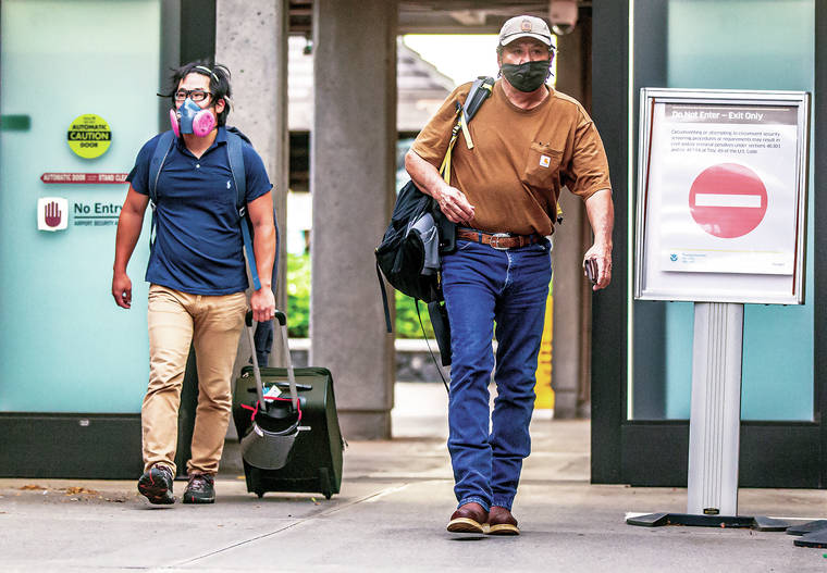 Travelers exit the terminal at Ellison Onizuka Kona International Airport after the arrival of a flight from Los Angeles. (Tom Linder/West Hawaii Today)