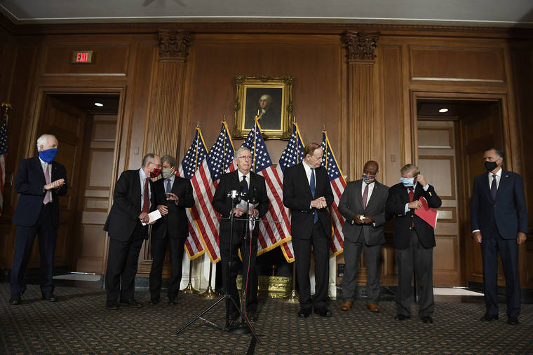 Senate Majority Leader Mitch McConnell of Ky., during a news conference on on Capitol Hill in Washington, Monday, July 27, 2020, to highlight their proposal for the next coronavirus stimulus bill. McConnell is joined by, from left, Sen. John Cornyn, R-Texas, Sen. Lamar Alexander, R-Tenn., Sen. Roy Blunt, R-Mo., Sen. Richard Shelby, R-Ala., Sen. Tim Scott, R-S.C., Sen. Lindsey Graham, R-S.C., and Sen. Mitt Romney, R-Utah. (AP Photo/Susan Walsh)