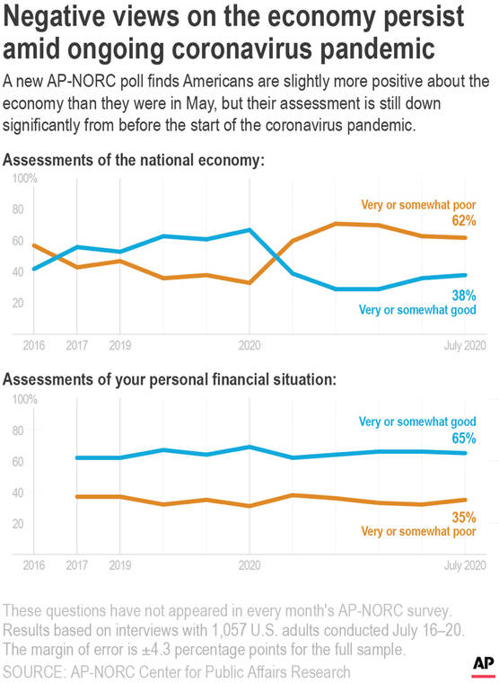 Analysts warn that the outlook could darken still further if Congress fails to enact enough financial aid to replace the expiring $600-a-week federal boost in unemployment benefits or provide sufficient help for businesses and state and local governments. Senate Republicans released a $1 trillion proposal on Monday that falls far short of a $3 trillion measure the House has passed, leaving an enormous gap for Democrats and Republicans to bridge as some elements of Congress’ earlier emergency relief programs run out.