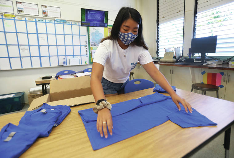 Kelsey Walling/Tribune-Herald Kara Yoshiyama folds Hilo High school t-shirts for this year in the student activities classroom on Thursday, July 30, 2020. The theme of this year is staying together through anything.