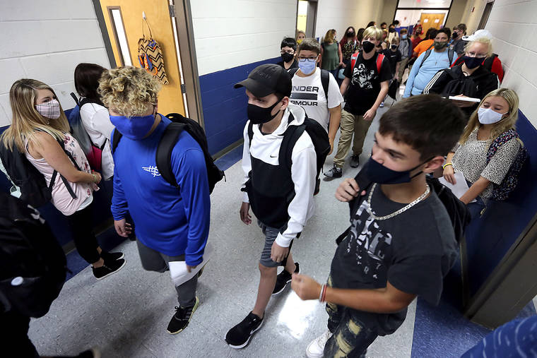 In this Aug. 6 photo, Guntown Middle School eighth graders walk the halls to their next class as others wait in their assigned spots against the wall before moving into their next class during the first day back to school for the Lee County District in Guntown, Miss. (Adam Robison/The Northeast Mississippi Daily Journal via AP, File)