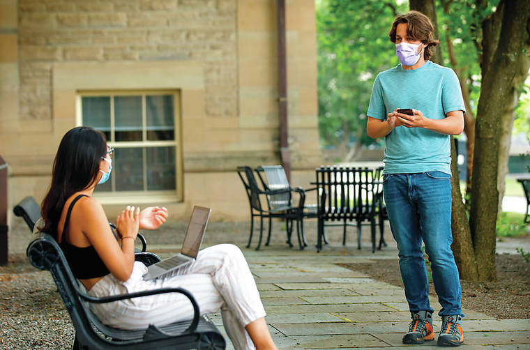 In this photo provided by Cornell University, Bryan Maley, right, a grad student in the Master of Public Health program, interviews a student on campus about mask-wearing experiences as part of a public health survey July 30 in Ithaca, N.Y. (Jason Koski/Cornell University via AP)
